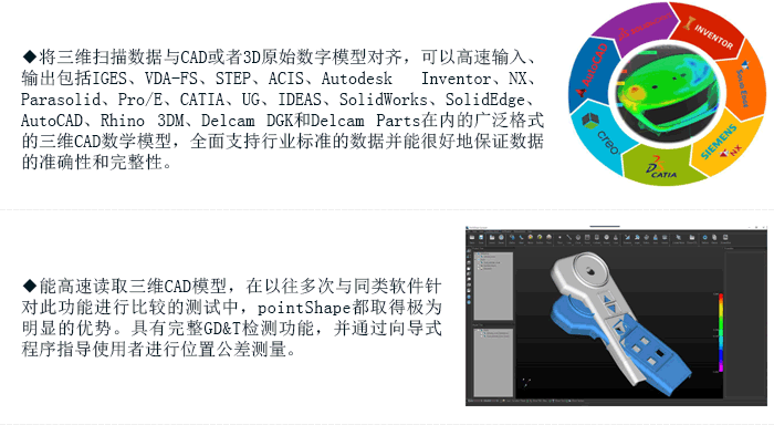 通過三維掃描儀等采集物體點數(shù)據(jù)和多邊形面數(shù)據(jù),在 3D數(shù)模檢測軟件檢測軟件中直接進(jìn)行數(shù)模檢測; 3D數(shù)模檢測軟件允許導(dǎo)入所有主要的CAD程序原始數(shù)據(jù),如Siemens NX,CATIA V5,Pro / ENGINEER,并且通過簡單的工作流程,友好的界面用戶和精確的計算,可有效減少人員及降低成本。