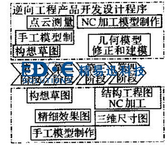 在工程技術(shù)人員的一般概念中,產(chǎn)品設(shè)計過程是一個從無到有的過程,即設(shè)計人員首先在大腦中構(gòu)思產(chǎn)品的外形、性能和大致的技術(shù)參數(shù)等,然后通過繪制圖紙建立產(chǎn)品的三維數(shù)字化模型,最終將這個模型轉(zhuǎn)入到制造流程中,完成產(chǎn)品的整個設(shè)計制造周期。這樣的產(chǎn)品設(shè)計過程我們稱為“正向設(shè)計”過程。逆向工程產(chǎn)品設(shè)計可以認(rèn)為是一個“從有到無”的過程。簡單地說,逆向工程產(chǎn)品設(shè)計就是根據(jù)已經(jīng)存在的產(chǎn)品模型,反向推出產(chǎn)品設(shè)計數(shù)據(jù)(包括設(shè)計圖紙或數(shù)字模型)的過程。從這個意義上說,逆向工程在工業(yè)設(shè)計中的應(yīng)用已經(jīng)很久了。早期的船舶工業(yè)中常用的船體放樣設(shè)計就是逆向工程的很好實例。隨著計算機技術(shù)在制造領(lǐng)域的廣泛應(yīng)用,特別是數(shù)字化測量技術(shù)的迅猛發(fā)展,基于測量數(shù)據(jù)的產(chǎn)品造型技術(shù)成為逆向工程技術(shù)關(guān)注的主要對象。通過數(shù)字化測量設(shè)備(如三維掃描儀、三坐標(biāo)等)獲取的物體表面的空間數(shù)據(jù),需要利用逆向工程技術(shù)建立產(chǎn)品的三維模型,進(jìn)而利用CAM系統(tǒng)完成產(chǎn)品的制造。因此,逆向工程技術(shù)可以認(rèn)為是將產(chǎn)品樣件轉(zhuǎn)化為三維模型的相關(guān)數(shù)字化技術(shù)和幾何建模技術(shù)的總稱。逆向工程的實施過程是多領(lǐng)域、多學(xué)科的協(xié)同過程。