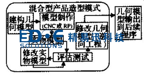 單純?nèi)鞒棠嫦蚬こ虝a(chǎn)生以下問題:資料量大、調(diào)取數(shù)據(jù)麻煩、曲面定位(Location)、曲面的連續(xù)性控制等。采用混合式設(shè)計流程,僅需要對修改部分作局部逆向工程快速重建、從而能縮短整個設(shè)計制造的程序。如圖3所示。